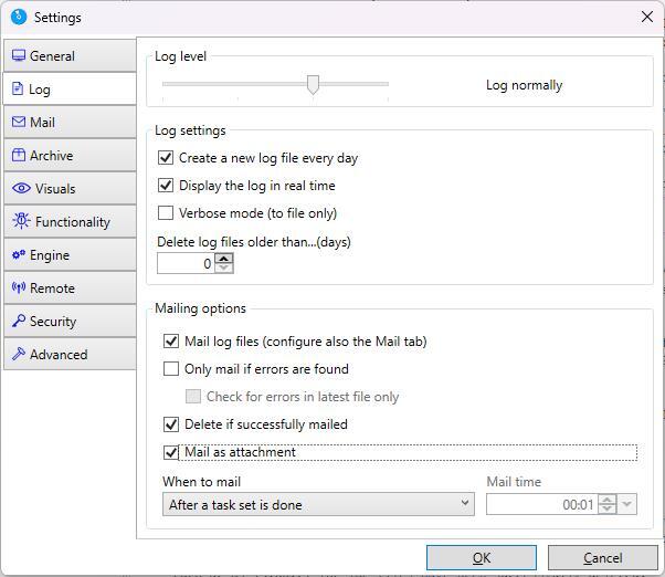 After configuring the Log settings, click OK or navigate to the Mail tab to configure email server settings.