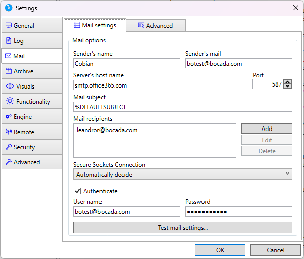 After completing all fields, use the Test mail settings button to verify the settings are configured correctly.
