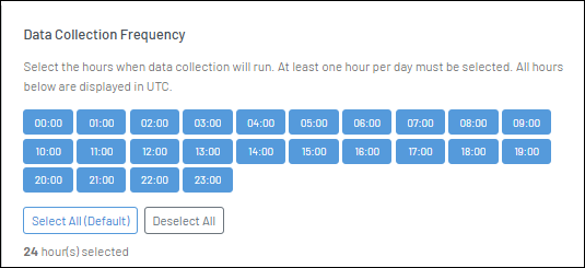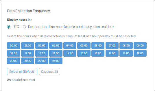 By default, all hours of the day are selected, meaning that data collection runs hourly. You can change that to only run during certain hours. Note: all hours are displayed in UTC which is how the data is displayed in Bocada Cloud's reports and UI.