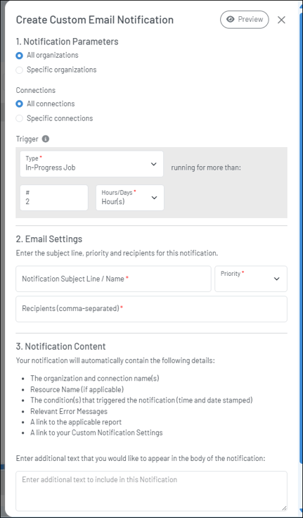- If you want the notification to apply to all Organizations, then select the first option (which is selected by default). This means that the trigger parameters and email recipients will be the same for any/all Organizations.