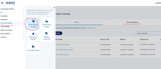• Navigate to “Storage & Backup”, then "IONOS Object Storage"