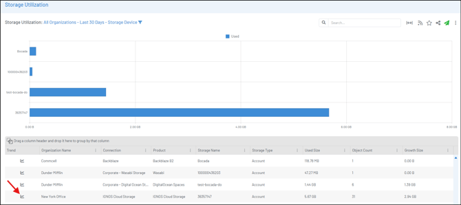 The report defaults to displaying the last 30 days for each connected storage device. You can click the trend icon in the far-left data column to view an individual device to see the utilization trend.