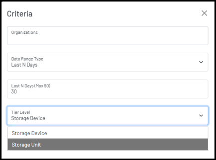 You can edit the report criteria by clicking the three-dot menu in the top right corner of the screen to view the data by one or multiple organizations; in a specific date range; or you can drill-down into the storage unit level.
