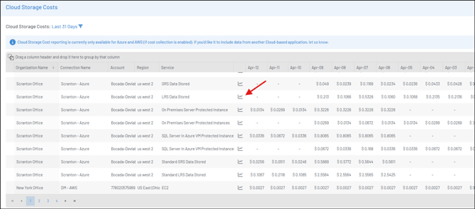 Click the trend icon to view a cost trend over time for each storage service (as in the screen shot below). To view a specific date range in days or months, click the three-dot menu at the top right of the report grid to Edit the report criteria.