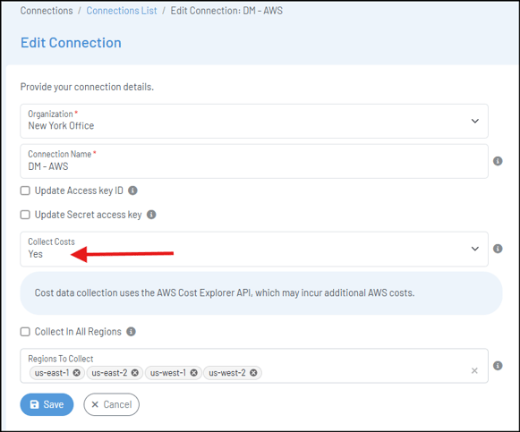 - AWS: to collect cost information, add a new or edit an existing AWS Backup connection. On the connection configuration page, select "Yes" in the Collect Costs field. Then you can either collect data from all regions, or specify one or more regions. Note: collecting AWS cost data may incur additional costs in your AWS account due to the use of the AWS Cost Explorer API.