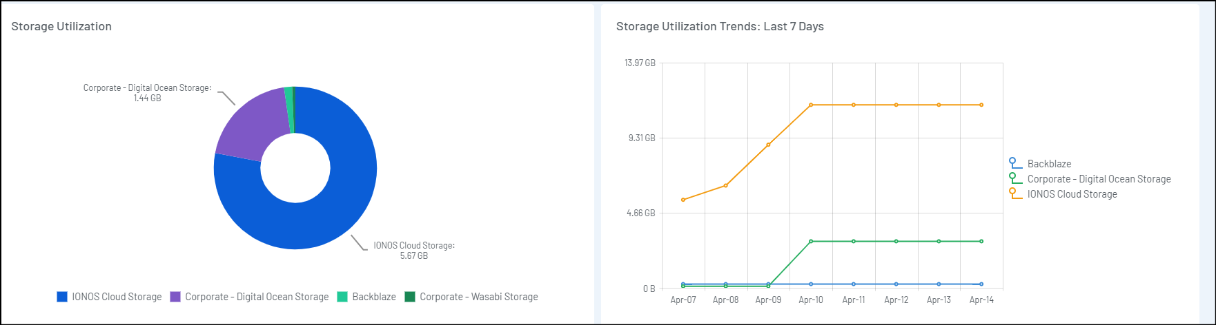 Once you connect to your storage data in Bocada Cloud, you'll see two storage widgets on your Dashboard populate with information, including a Storage Utilization Pie Chart, as well as a Storage Utilization Trends graph, across all connected storage systems.